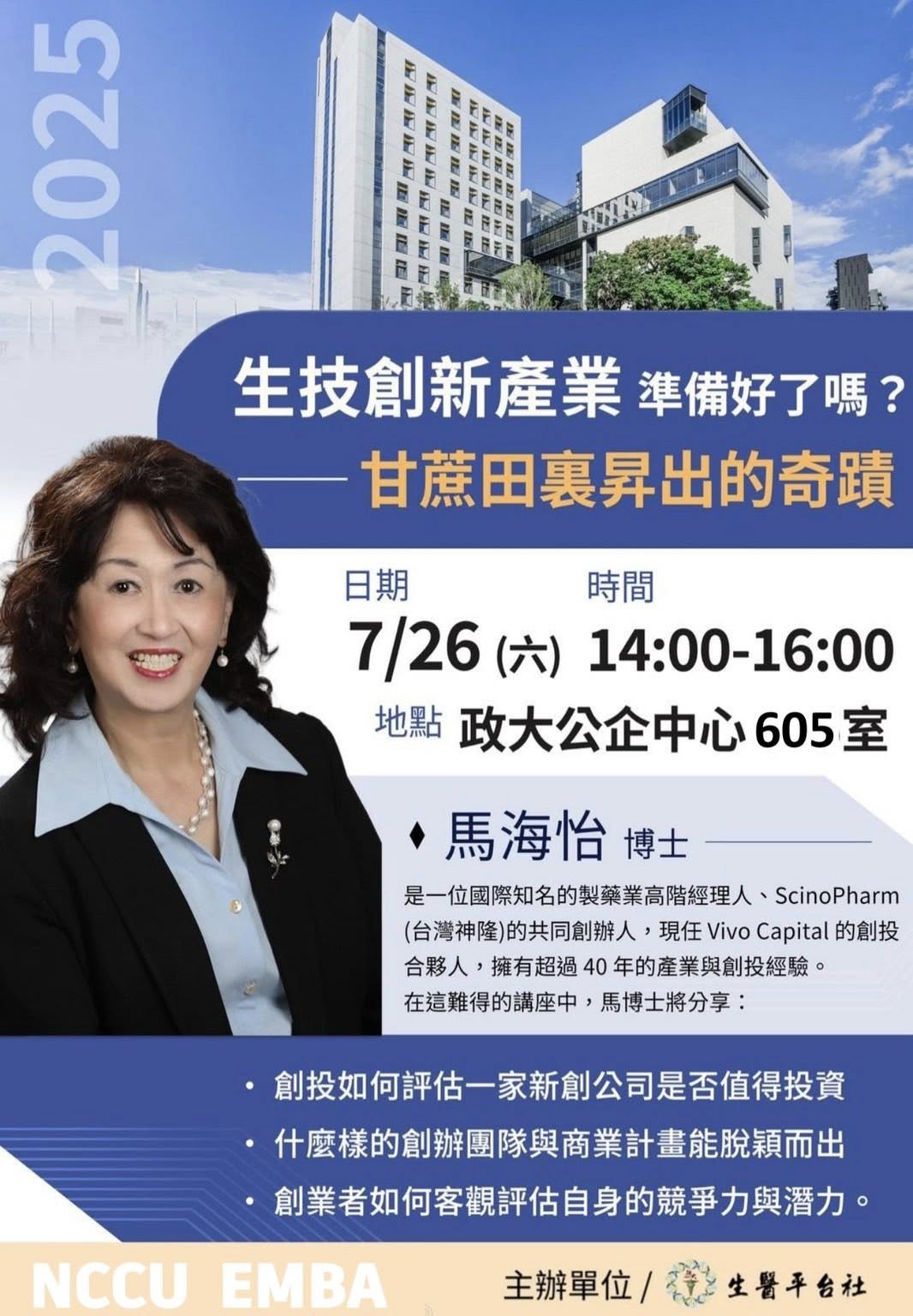 亞洲生技產業年度盛會《2025 BIO Asia–Taiwan亞洲生技大會》於7月23日至 27日於台北南港展覽館1館與2館盛大登場。因為這場盛會我們有幸迎來國際級生技投資領袖馬海怡博士,她是台灣神隆 ScinoPharm 共同創辦人、Vivo Capital 創投合夥人,擁有橫跨製藥業與創投界超過40年的卓越經歷。她親身參與無數生技投資決策、協助多家創新公司走向國際舞台,堪稱「生技創業者的伯樂」,馬博士為生醫平台社帶來一場極精彩的演講!