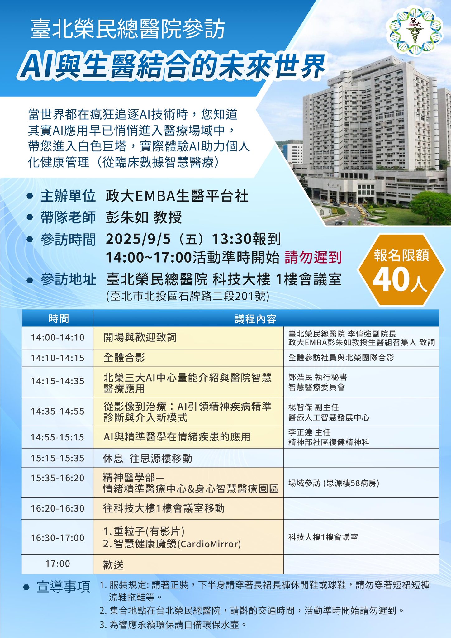 活動甫一推出,短短數小時內便報名額滿,展現學長姐們對智慧醫療的高度關注。活動當天,在指導老師彭朱如老師及陳冠儒老師的帶隊下,大家前往臺北榮民總醫院。北榮以高規格禮遇接待,由李偉強副院長、智慧醫療委員會秘書長鄭浩民主任、醫療人工智慧發展中心楊智傑主任、以及精神部社區復健精神科李正達主任等重量級團隊親自出面迎接,陣容盛大,讓政大學長姐深刻感受到北榮對本次參訪的重視。