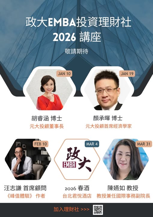 政大EMBA投資理財社活動預告 學長姐請先預留時間! [2026年第一季] 一月: 01/09(五) 胡睿涵 01/19(一) 顏承暉 二月: 02/10(二) 汪志謙 教授 (線上) 三月: 03/04(三) 春酒|台北君悅酒店 Grand Hyatt 03/31(二) 陳嬿如 教授 還沒報名加入2026 理財社的學長姐,手刀報名囉! 2026入社暨春酒報名表 報名表:https://forms.gle/Lpt6TNa2jTbDK5iGA 春酒報名查詢:https://reurl.cc/Om9err