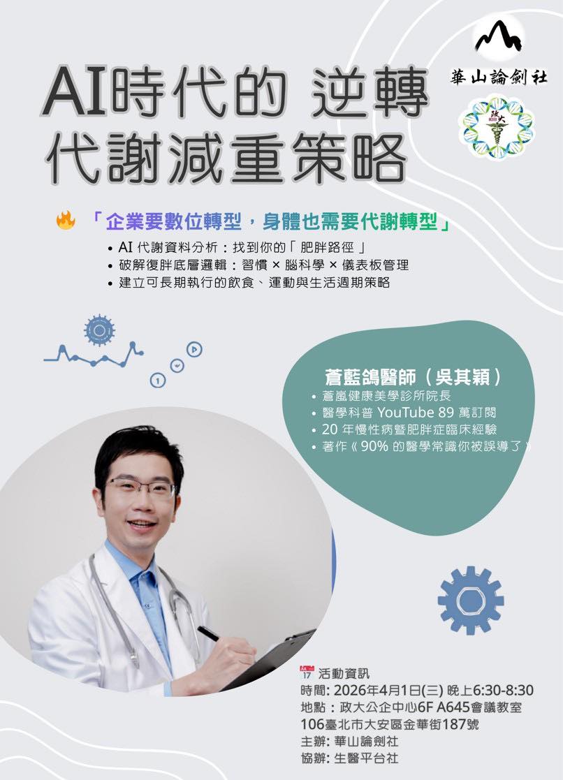 華山論劍社+生醫平台社雙社AI智慧醫療講座來了 AI時代的逆轉代謝減重策略 您在忙碌職場與生活中經常嘗試減重,卻反覆復胖?企業要數位轉型,身體也需要代謝轉型 邀請白袍網紅名醫講師: 蒼藍鴿(吳其穎醫師) 蒼嵐健康美學診所院長 醫學科普 YouTube 89 萬訂閱 20年慢性病暨肥胖症臨床經驗 著作《90% 的醫學常識你被誤導了》 透過這個課程您將學習 AI 代謝資料分析:找到你的「肥胖路徑」 破解復胖底層邏輯:習慣×腦科學×儀表板管理 建立可長期執行的飲食、運動與生活週期策略 時間:2026年4月1日(三)晚上6:30-8:30 地點:政大公企中心6F A645會議教室(臺北市大安區金華街187號) 華山論劍及生醫平台社社員優先免費報名(報名待核準身份確認才算成功,暫不開放非社員) 請手刀限額90個名額,經管理者社員身分份確認後才算報名成功喔!先搶先贏 https://luma.com/pn4cyo73