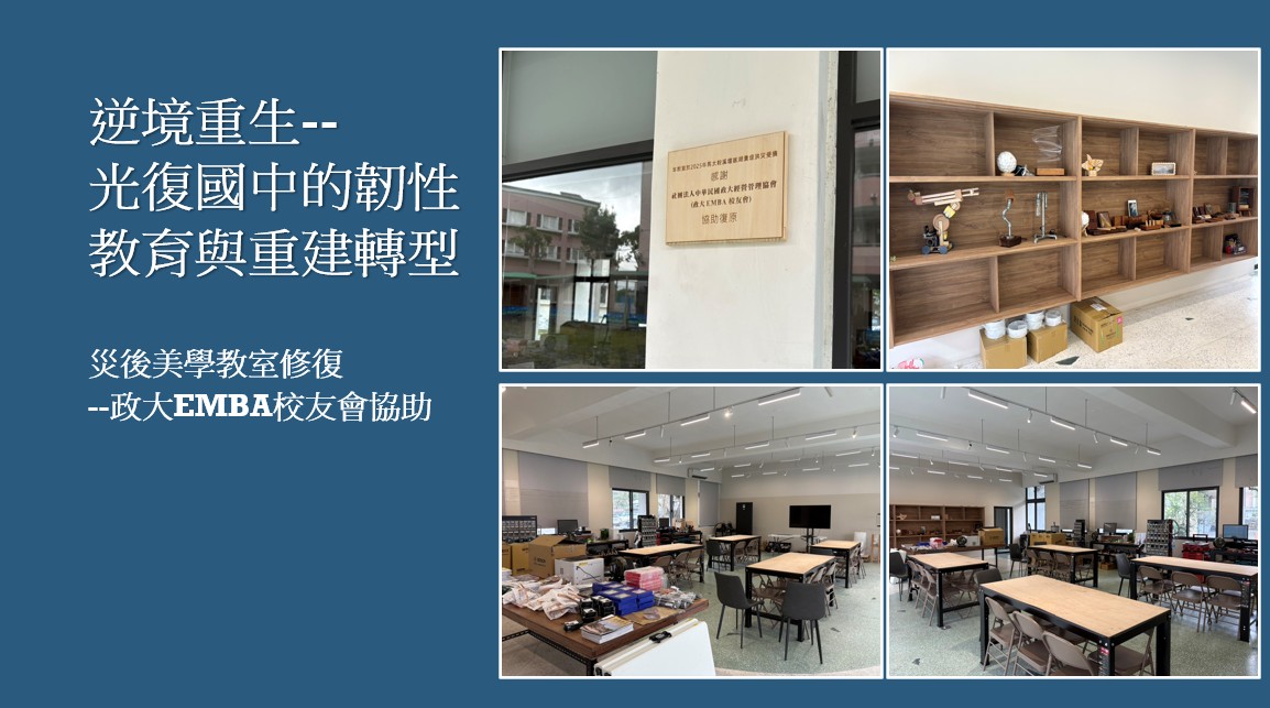 政大EMBA校友會理事長許先越先生責成本案召集人林香蘭女士統籌推動,並向全體校友及所有捐款人及關心此案的社會各界,致上最誠摯的謝意。許先越理事長表示:「偏鄉孩子面對的不只是一次天災的打擊,更是教育資源長期不均的挑戰;政大EMBA校友會希望透過實際行動,陪伴光復國中走過災後最艱難的階段,也盼望拋磚引玉,讓更多資源長期投入偏鄉教育與校園安全。」未來,政大EMBA校友會將持續與光復國中保持密切合作,定期追蹤重建進度與經費運用情形,確保每一筆善款都用在最需要的地方,同時持續推動ESG與公益行動,讓校友的專業與資源成為支持社會永續發展的重要力量。